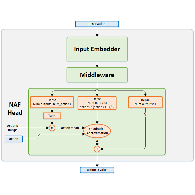 The current state is used as an input to the network. The action mean is extracted from the output head. It is then passed to the exploration policy which adds noise in order to encourage exploration.