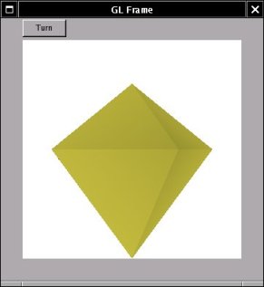 Just like the Xlib functions, we can use a drawable for drawing 3 dimensional images with the OpenGL/Mesa GL libraries. This section will show how to use a WINGs frame for this. The application shall have a GL-window and one button which allows the user to turn the object in the frame.